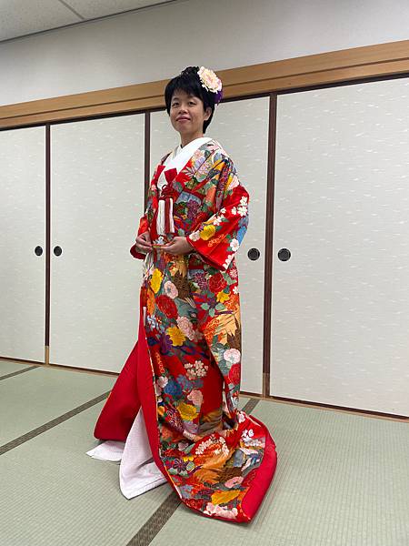 因為結業要拍照,所以在教室拍了花嫁服飾。真的很重,不管是自己穿還是幫別人穿。開始上和服課是2021年的4月,兩年一下子就過完了,我竟然就這樣上到可以去工作的程度,不過短時間沒考慮轉換跑道到和服界😅說歸說,有課會繼續上,不然沒有機會練習穿和服。